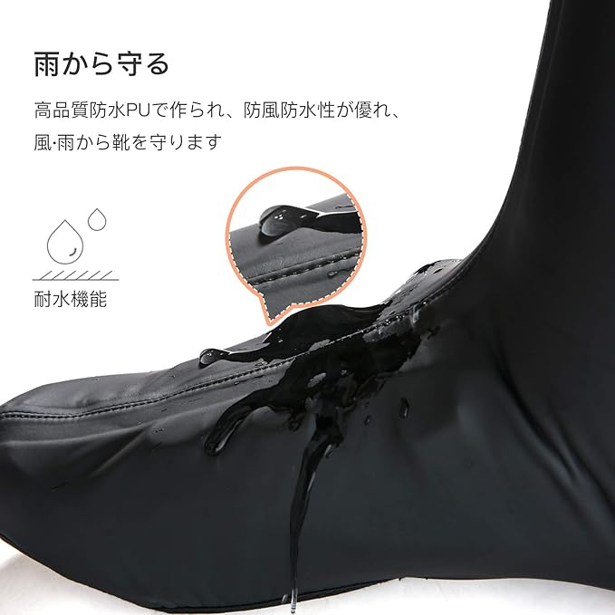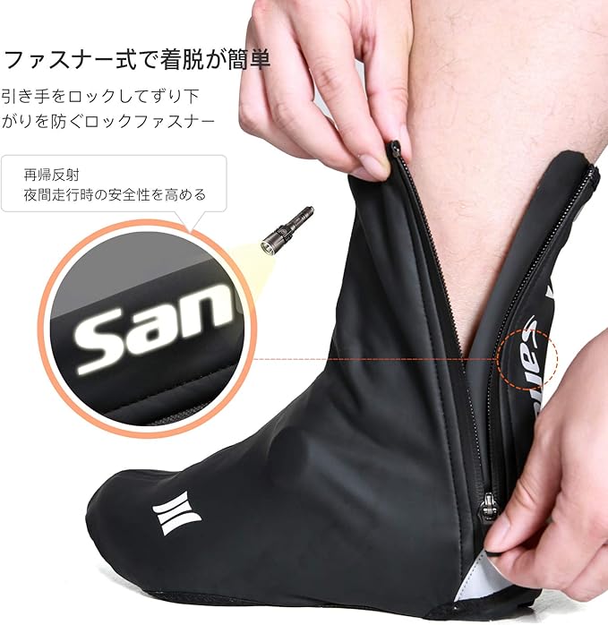 【安全設計】かかと部分には反射素材が備わっているので、夜間でもほかの車や自転車からの視認性が高く、安心して走行できます。前面部分に滑り止め加工ですので、つま先から足首まで全てを保護する。