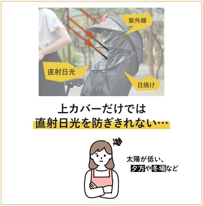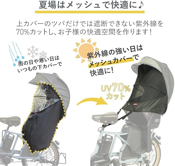 上カバーだけでは防ぎにくい朝日や西日などの日差しからお子様を守るメッシュオプション登場! UV70%カット