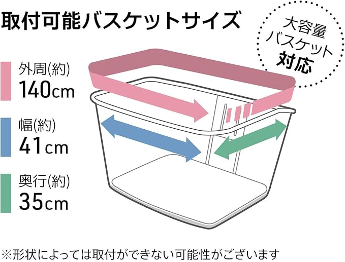 荷物の量に合わせてフレキシブルに対応荷物の量や大きさを気にせず、カバーの方が荷物の量に合わせる自由設計。これまで収まりにくかった長いものや大きなものも、しっかりとカバーして、急に振り出した雨による水ぬれや、ちょっとした段差での飛び出しを防ぎます。最大60cmまで対応取付可能バスケットサイズ:外周(約)140cm 幅(約)41cm 奥行(約)35cmワンタッチマグネットボタン付き大容量バスケット対応 ※形状によっては取付ができない可能性がございます。