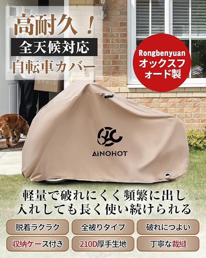 【210Dオックスフォード】210D(デニール)厚くて丈夫なオックスフォード生地を採用し、丈夫で耐久性に優れています。軽量で破れにくく頻繁に出し入れしても長く使い続けられます。また、劣化しにくい素材なので、長い期間屋外で使え、長い期間自転車を風雨から守ることができます。
