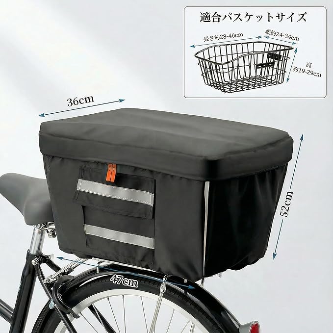 【雨・横風・泥はね対策|レインカバーとして実用的】上からの雨だけでなく、横風で吹き込む雨や路面の泥はねにも配慮。梅雨・台風シーズンの自転車移動で“濡らしたくない荷物”を守ります