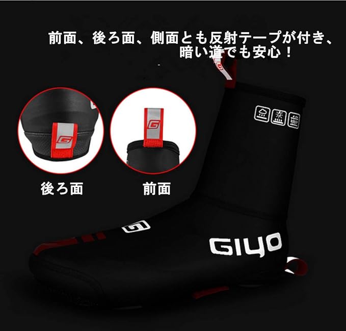 前面、側面、後ろ面とも反射テープがあり、夜の安全性を高めます。土踏まずのベルクロ部分で大きさを微調整でき、滑り止め加工もされており、ペダルから滑らない。
