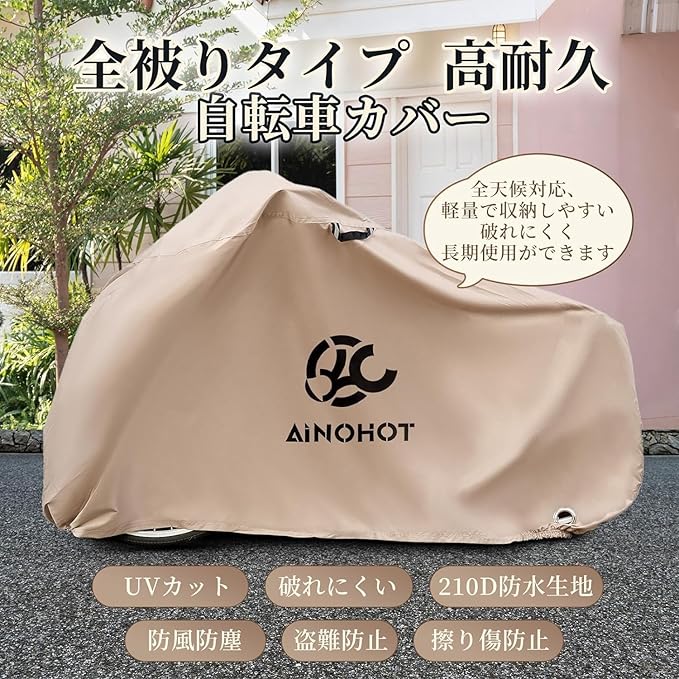 自転車カバー 防水 厚手 日焼け防止/防雪/霜防止 全被り 破れにくい 高耐久 雨避けカバー 盗難防止ロック穴付き 防風&防塵 耐熱 UVカット 電動自転車対応 210Dオックス製 バイクカバー 収納袋付き ベージュ