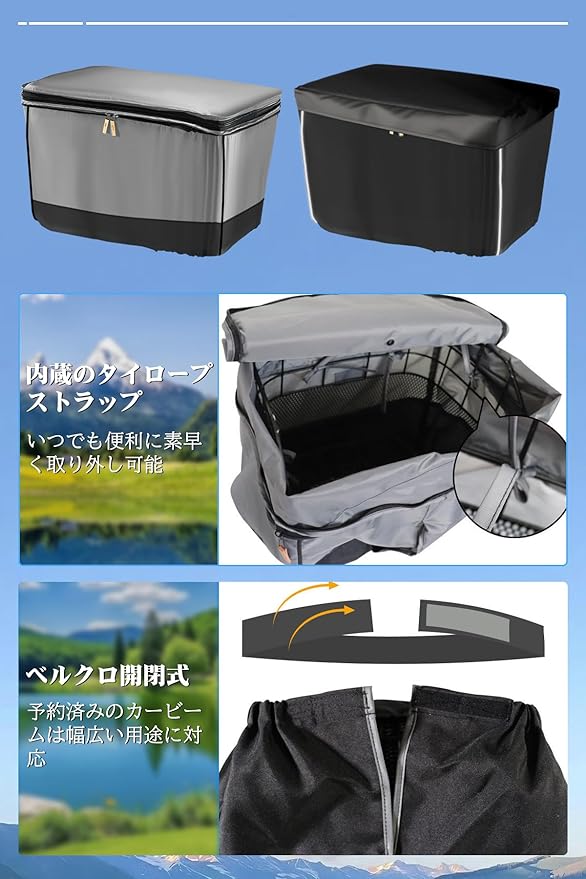 【取り付け】カバー内にズレ防止用のロープがあり、かごと前かごカバーをしっかりと連結固定することができます。 さまざまな大きさのかごに適応するために、マジックテープでかごの大きさを調整することができます。