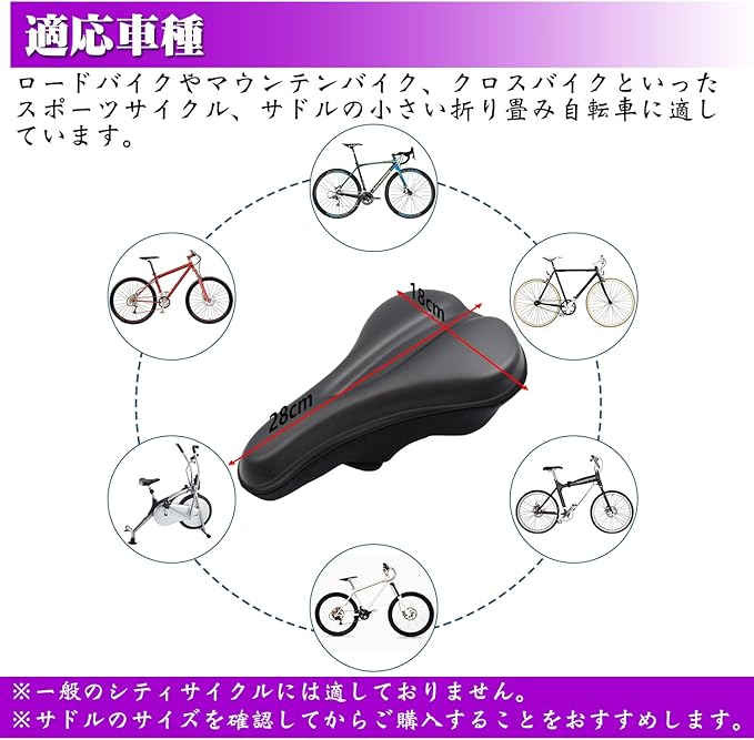 適用サドルの長さ:25~27.5cm,適用サドルの幅:13~15cm,※サドルのサイズを確認してからご購入することをおすすめします。マウンテンバイク、ロードバイク、クロスバイクなどのスポーツ自転車用の細身のサドルに適用しています。