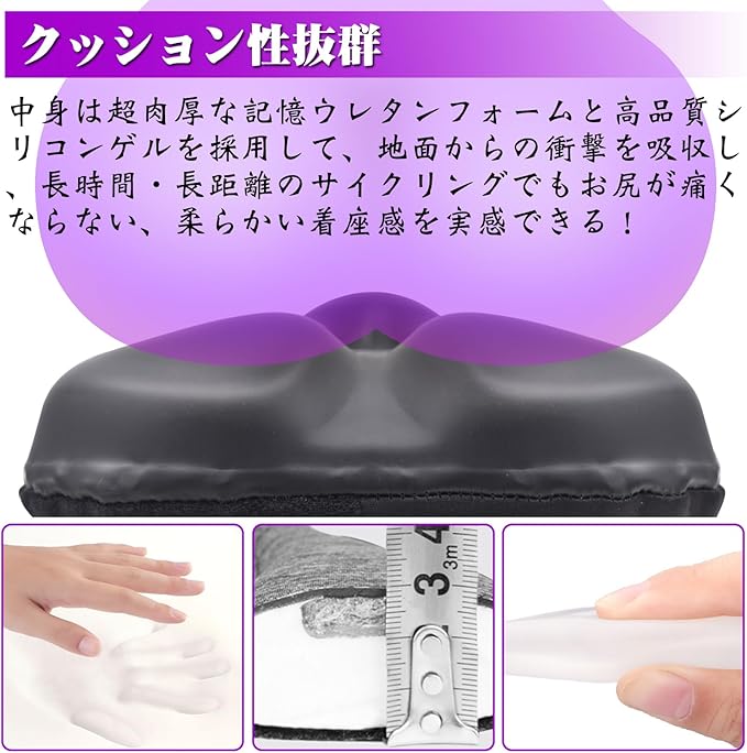 ◆おしりの痛みを軽減◆ 超肉厚な低反発ウレタンフォームと高弾力シリコンゲルを採用して、サドルの硬さを和らげ、地面からの衝撃も吸収してくれて、振動によるお尻の痛みが大幅に緩和されます。長時間乗ってもお尻が痛くならない。