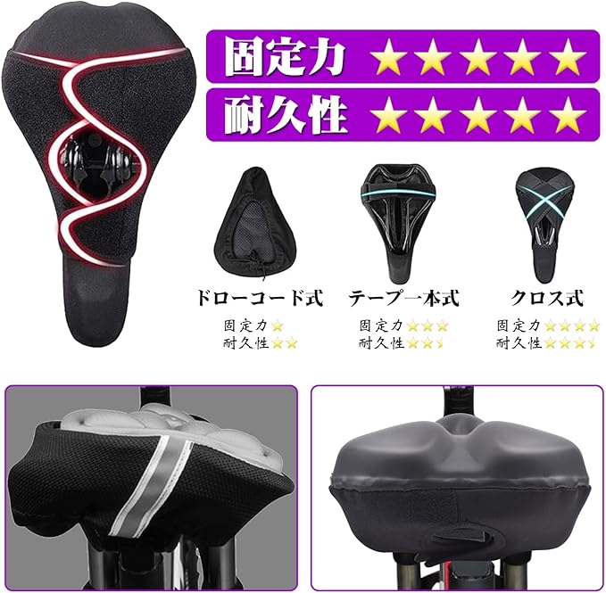 ◆滑り止め加工・ズレない◆ クロスマジックテープでしっかりとサドルへ固定できる。カバーの裏面に滑り止めのゴム粒子が施されて、長距離・長時間走行してもずれにくいです。