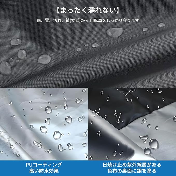 【高耐久性】自転車カバーは本織りグレードの210D牛首布で作られ、0.8mm厚、破れにくい、50%高い経年強度、PUコーティングと銀膜防汚層はUPF50+防汚性能と3000mm防水性能を提供します。大雨、直射日光、霜、砂から愛車を守ります。