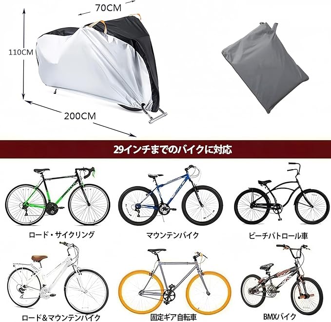 高品質の210Dオックスフォード生地を採用し、厚い生地、ダブルステッチが壊れにくい、PU両面コーティング、防水性と耐久性が優れている、200幅70高110の長さの自転車カバーのサイズは、29インチまでのバイクに適し、紫外線、風、ほこり、雨、雪やその他の浸食から自転車の表面を保護するために、屋外駐車場や屋内保管は便利です、日常使用する29インチまでのバイクに適しています。 29インチ以下のバイクの日常的な保護と悪天候時の緊急使用に適しています。