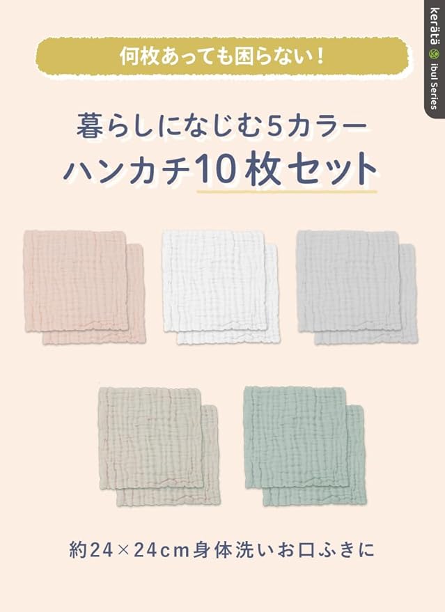 【素材】コットン100% 【カラー】ピンク グリーン ベージュ グレー ホワイト【サイズ】約24 24cm(ガーゼの特性上、サイズに個体差がございますのでご了承ください) 【内容量】10枚(5色各2枚)