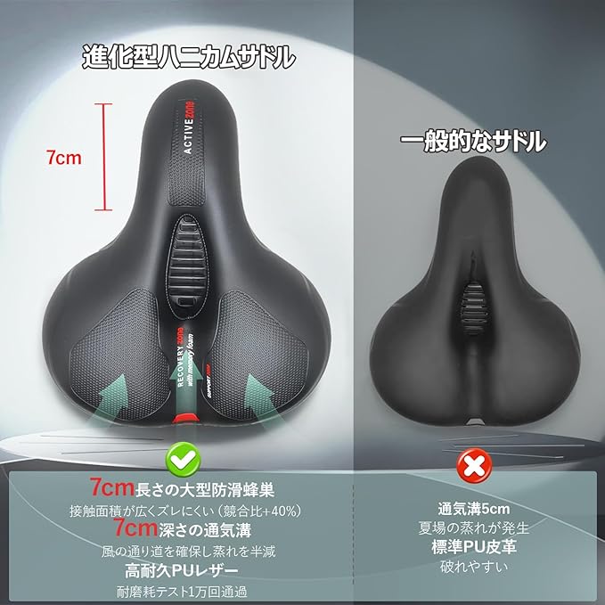 【耐久性・安全性】高品質PUレザーと強化高密度スポンジの組み合わせで、防水性と耐磨耗性に優れています。サドル後部には細長反射テープを装備。夜間視認性を向上させ、安全性を高めます。