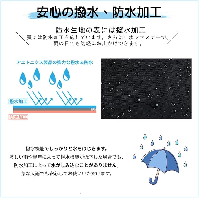 優れた防水・耐水性:表面には撥水加工、裏面には耐水圧加工(2000mm)が施されている防水生地です。水分が生地の内側まで染み込むことがありません。