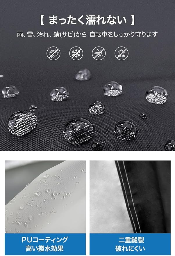 【高品質の300Dオックスフォード生地で作られた自転車カバー】高品質の300Dオックスフォード防裂・耐退色生地を採用し、防水性と耐久性に優れた自転車カバーです。PUコーティング加工により高い撥水効果を実現し、雨、雪、氷、風、ほこり、直射日光など、あらゆる悪天候から自転車をしっかり保護します。さらに二重縫製加工で、長期間の使用でも破れにくく安心です。軽量設計で持ち運びも簡単、日常使いに最適です。