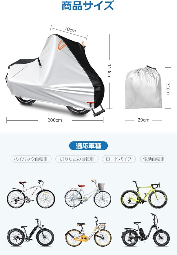 【2サイズ 自転車カバー】200*110*70cmと150*85*60cmの2サイズをご用意しています。200*110*70cmは電動自転車、一般成人用自転車、マウンテンバイクなど、ほとんどの標準的な自転車(29インチまで対応)に対応します。150*85*60cmは子供用自転車(20インチまで対応)に最適です。自転車のサイズに合わせてお選びいただけるため、ぴったりフィットするカバーが見つかります。