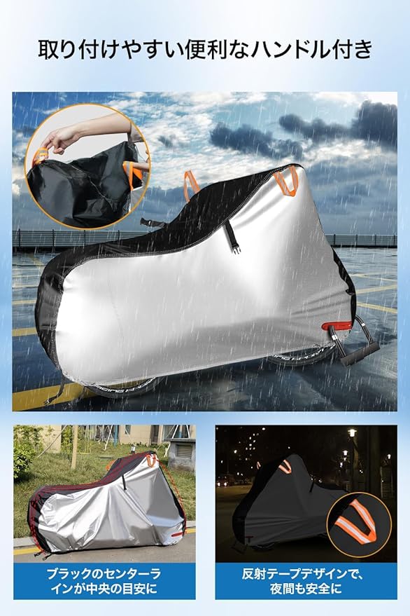 【取り扱いやすいハンドルと反射テープの一体型デザイン】カバーの両サイドには取り外しやすいハンドルが装備されており、使いやすさ抜群です。また、夜間の安全を考慮した反射テープがデザインされているため、夜道でも安心して使用できます。カバーの上部にはバックルがあり、濡れたカバーを吊り下げて乾燥させることができ、カバーの寿命を延ばすことができます。便利で機能的なデザインが特徴です。
