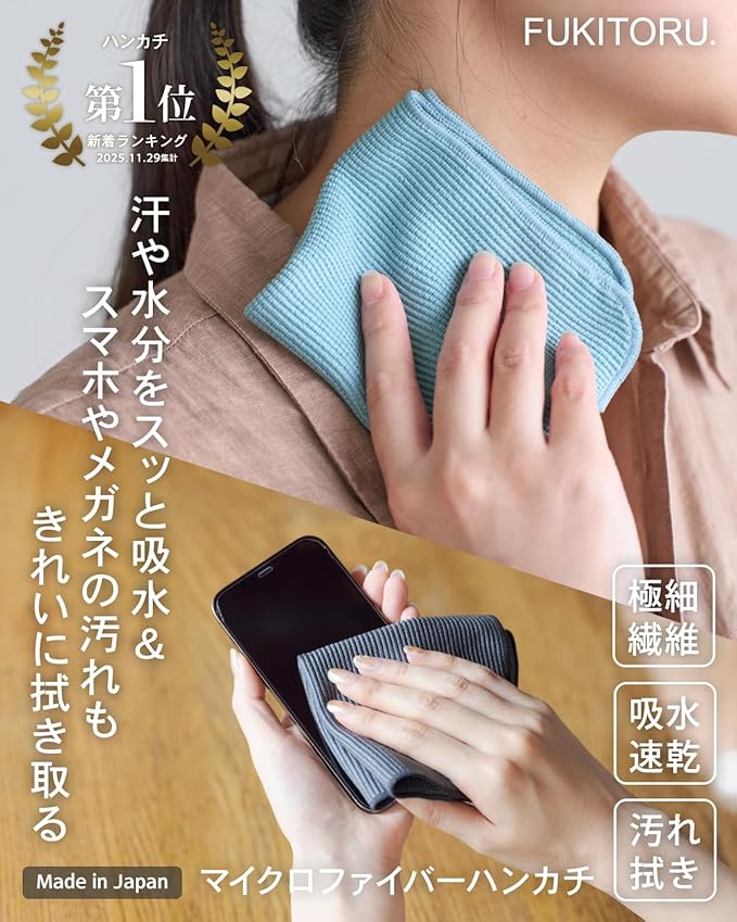 [FUKITORU.] ハンカチ メガネ・スマホ画面も拭ける マイクロファイバーハンカチ 日本製 吸水速乾 メガネ拭き ビジネスマン コンパクト ポケットサイズ 23x20cm 3枚セット | A GEN STORE