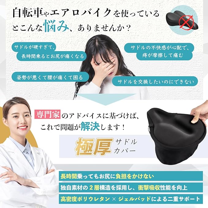自転車 サドルカバー サドルクッション 超肉厚 低反発 衝撃吸収 お尻が痛くない エア ふわふわ触感 超極厚 上質素材 防水防塵 エアロバイクに最適 通勤通学使用可