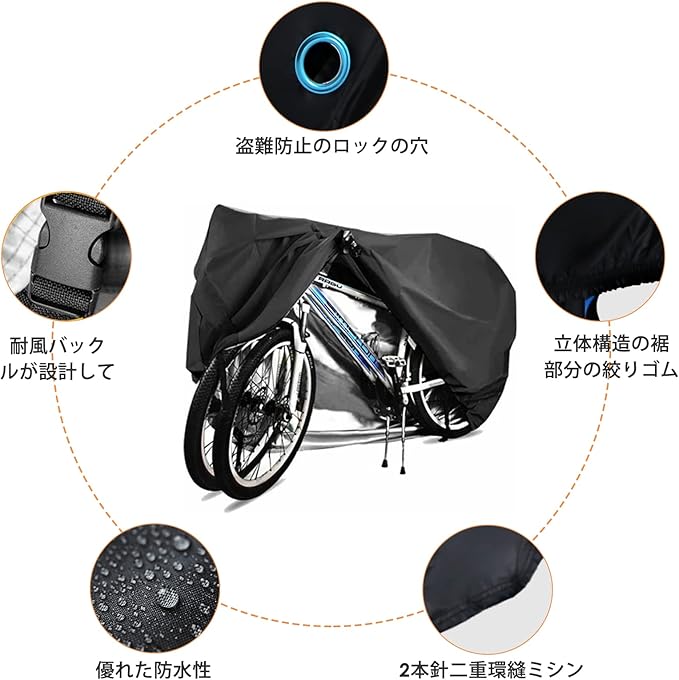 【盗難防止で安全性が高い】自転車カバーは前部に盗難防止のリング穴がついているので、ワイヤーロックを取り付け可能です。 大口径ロック用ホールを採用して、鍵を通せば盗難防止にできます。立体構造の裾部分の絞りゴムで自転車をしっかりカバーします。また耐風バックルが二つ設計して、防風力を補強します。