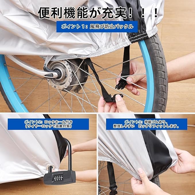 自転車カバー 厚手 210D シルバー クス製 防犯防風 盗難防止 雨避け 鍵穴盗難防止 雨雪対応 防水 ロックホール付き 収納袋付き 破れにくい 子供・電動自転車・原付対応 カゴ雨よけ (190T大人 シルバー)