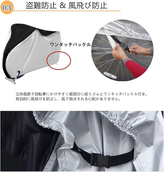 【優れた防風効果、盗難防止】立体裁断で自転車にかけやすく裾部分に絞りゴムとワンタッチバックル付き。前輪はロック用の盗難防止穴を採用、様々なロックに適用し、前後輪も風飛び防止のワンタッチバックル付き。盗難防止効果に抜群だけでなく、有効的に風飛びを防止し、風で飛ばされる心配がありません。
