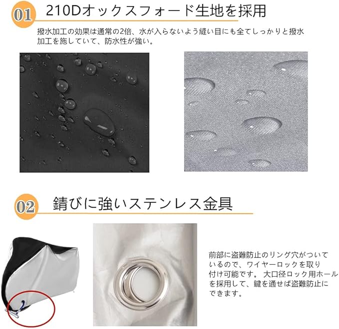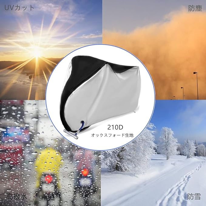【高品質210Dオック生地、丈夫で長持ち】耐久性にすぐれた210Dオックスフォードを採用し、強度は190Tナイロン製(従来品)のおよそ2倍以上で、ビニール製の10倍以上を誇ります。また、自転車カバーは精密な二重縫製で、とても丈夫で、柔らかくて破れにくいのです。