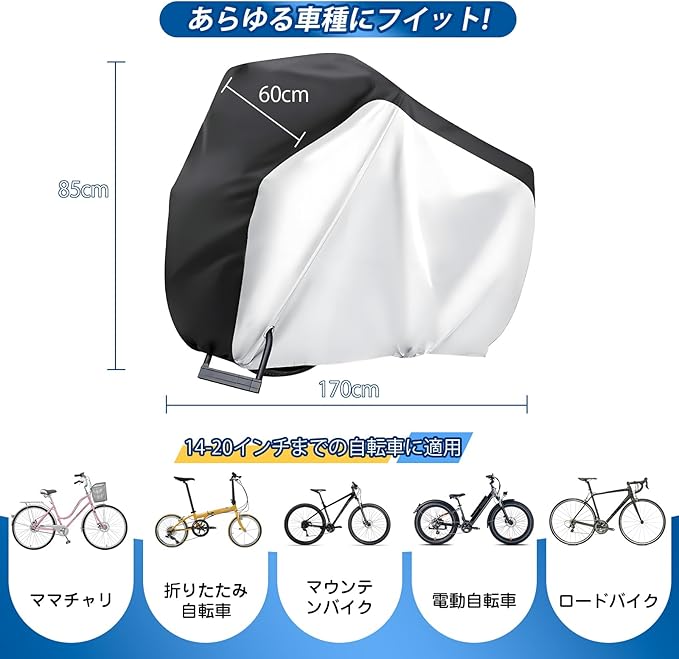 子供用自転車にちょうどいいサイズ設計(14〜20インチ対応)WUXIAOCSGの自転車カバー 子供用は、14〜20インチの子供用自転車に対応したSサイズ仕様。サイズは長さ170cm 幅60cm 高さ85cmで、通学・習い事・日常使いの自転車を想定した設計です。屋外保管時の雨・ホコリ対策として使いやすい自転車カバーです。