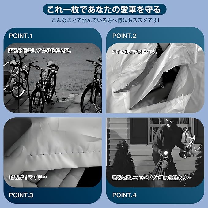 防水仕様・210D厚手生地で日常使用に配慮210D高密度ポリエステル生地を採用した自転車カバー 防水 厚手タイプ。しっかりとした生地感で、日常の出し入れや屋外設置を想定し、破れにくさと耐久性を考慮した設計になっています。雨・風・砂ぼこりなど、屋外環境での使用に配慮しています。