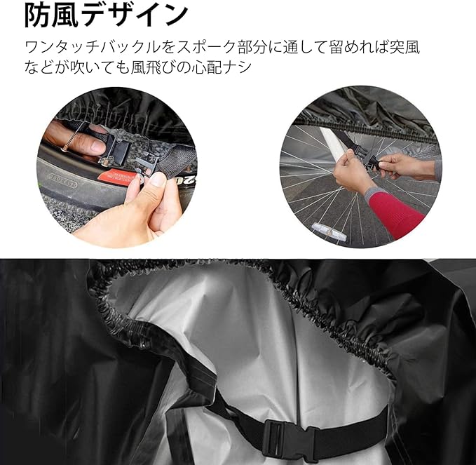 【盗難防止&風飛び防止】カバーの上から施錠できるよう、大きめのロックホールを採用しました。自転車とカバーをしっかりと守ることができます。さらに、ワンタッチバックルをスポーク部分に通して留めれば突風などが吹いても風飛びの心配ナシ!また、サイクルカバーの裾部分は絞りゴムになっているので、風によるカバーのバタ付きもある程度抑えることができます。