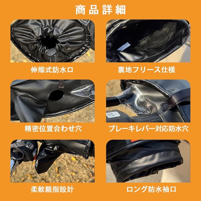 ️ 【防水設計】長めの袖口裏地と調整可能な締め付け装置を組み合わせ、雨水の浸入を効果的に遮断。PU表面素材とブレーキレバー専用雨よけが立体的な防水バリアを形成し、様々な走行環境に対応。