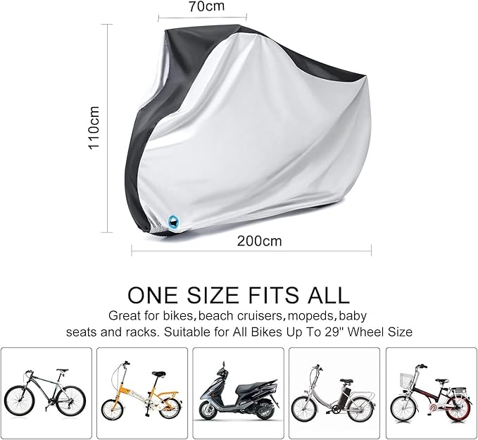 自転車カバー 防水 厚手 破れにくい バイクカバー 電動アシストUV加工 耐熱 サイクルカバー 丈夫 盗難防止 防風バックル 防塵 雨避け 雨雪対応でき 29インチまで 収納袋付き オリジナルポケットティッシュ付き