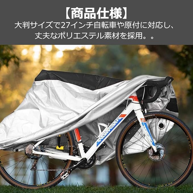 【商品仕様】大判サイズで27インチ自転車や原付に対応し、丈夫なポリエステル素材を採用。