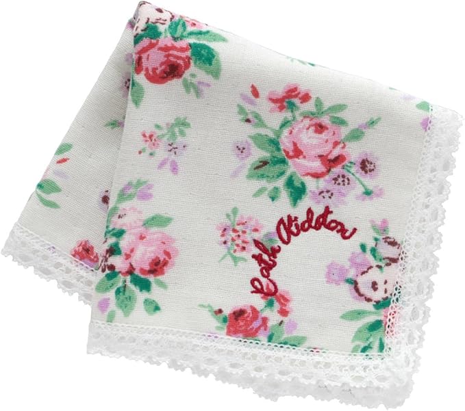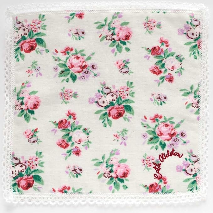 【Cath Kidston】表面はアイコニックなフラワープリントを施したガーゼ地、裏面はふわふわのパイルです。少し大きめの28cmサイズ。縁にあしらった細いレースが可憐で可愛らしい印象です。