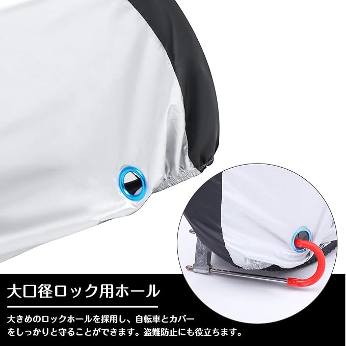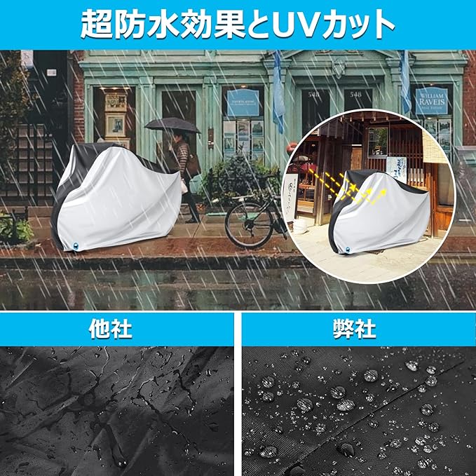 【高い撥水効果・99.9%UVカット】撥水加工の効果は通常の自転車カバー2倍です。カバーの表面は、高分子断熱材料を採用し、紫外線に対するバリアを形成し、紫外線を99.9%以上カットします。日焼けにさらされることによる自転車本体の劣化や損傷からも大事な車を守ります。それに、風の侵入を防ぎバタつきを抑え、雨、雪、ほこり、ゴミ、摩擦などから最小限に抑えることができます。