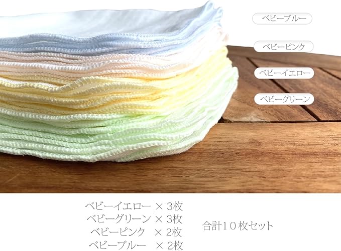 内容量:10枚入り ベビーイエロー(黄色) 3枚 / ベビーグリーン(緑) 3枚 / ベビーピンク(ピンク) 2枚 / ベビーブルー(青) 2枚