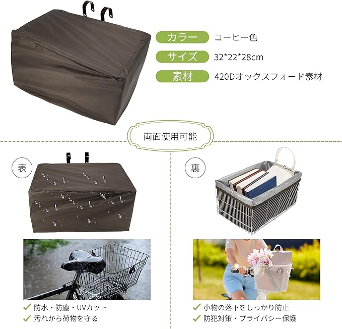 自転車かごカバー 前 防水 前後兼用 自転車カゴカバー 32*22*28cm 防塵 雪対応 日焼け防止 バスケット用 前かご 後ろカゴ 420Dオックスフォード コーヒー色
