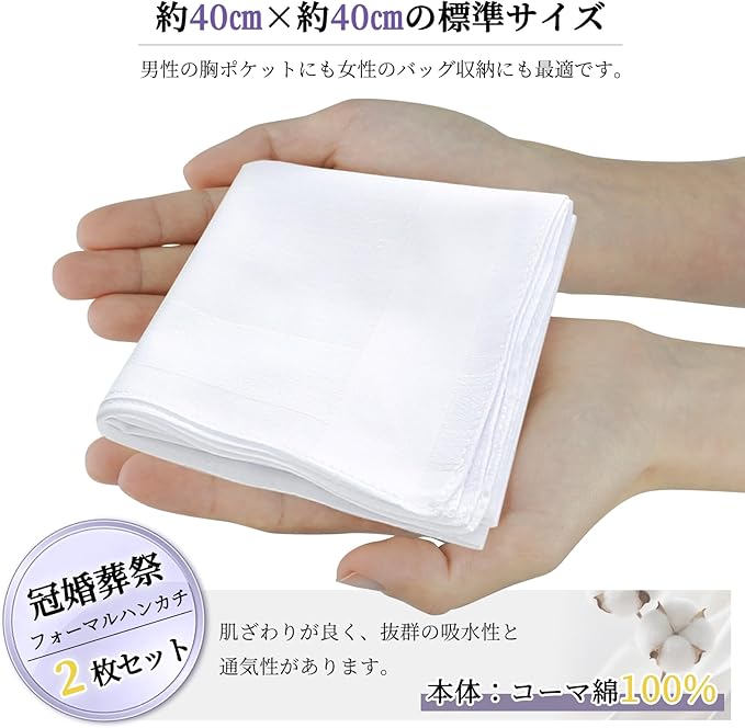 冠婚葬祭に最適なフォーマルハンカチです。結婚式のブライダルハンカチ、葬儀の葬式ハンカチ、入学式・卒業式の記念品として、格式あるシーンを演出します。