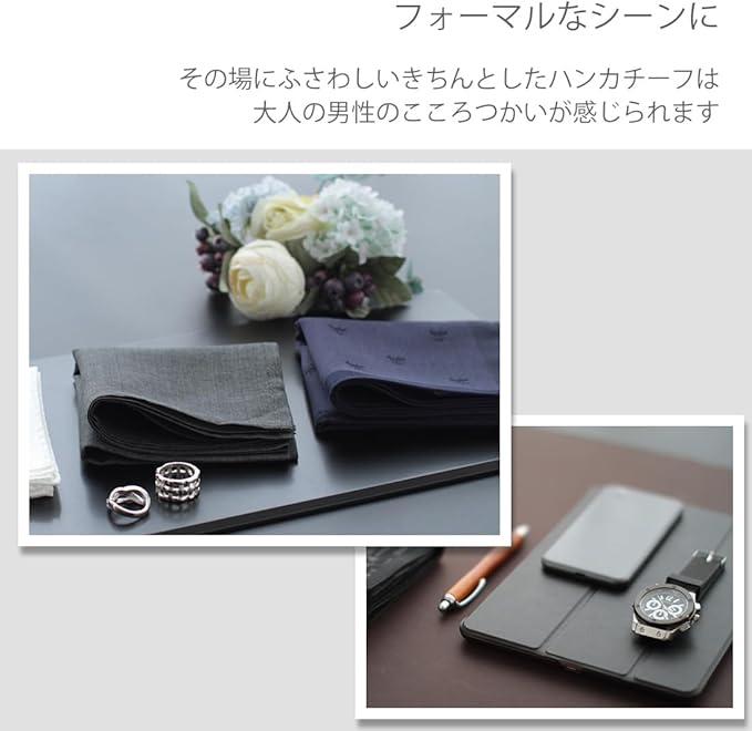 フォーマルな場面で、意外に気になるハンカチーフ。その場にふさわしい、きちんとした紳士のハンカチーフには、大人の男性のこころづかいが感じられます。ぜひ揃えておかれてはいかがでしょうか。
