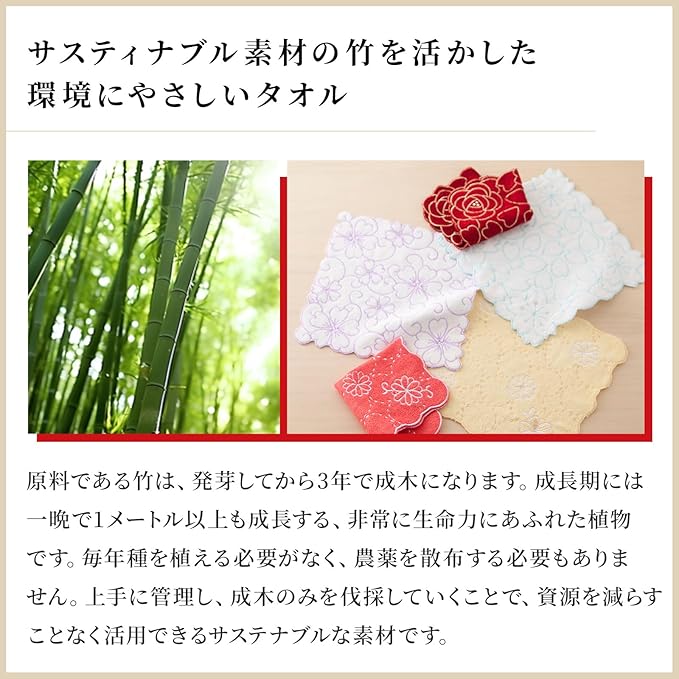 【竹の特性を活かして作られたなめらかな肌触りの癒しのタオルです】(1)天然の抗菌性でいつも衛生的です/(2)天然の消臭効果で臭いが気にならない/(3)竹素材特有の吸水性に優れています/(4)静電気が発生しにくいので肌に優しい/(5)天然の温熱性と保湿性でふんわり温かな触り心地