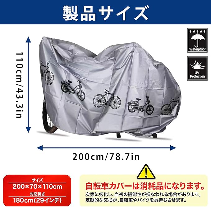 【収納袋付き&一年安心保証】自転車カバーのサイズは約200cm x 110cm x 70cm。サイクルカバーと同じの高品質素材の収納袋も付属されており、未使用時や持ち運びの際は専用ケースにコンパクトに収納できます。しかも軽いのでお気軽に持ち出せます!面倒な取付は一切なし、カバーを被せるだけなので女性にも優しい設計。収納袋を簡単に開閉できます。品質に自信があるからこそ、ご購入日より1一年品質保証がありますので,商品使用中、万が一製品品質上の問題にご満足いただけない場合は、ぜひFavuit まで【メール】にてご連絡下さい。