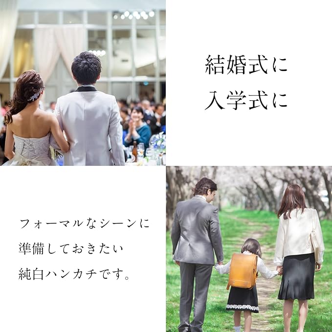 【冠婚葬祭やフォーマルの場で最適】真っ白で純白な高品位ハンカチで、柄のないシンプルでプレーンなハンカチです。