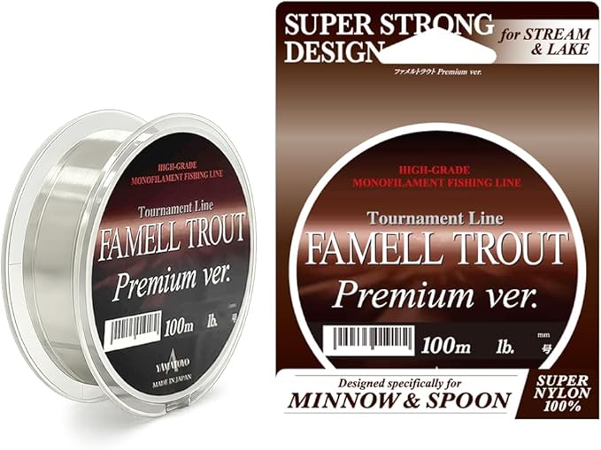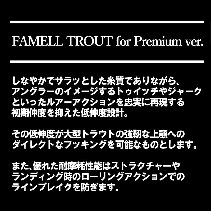 シリーズ:【ファメルトラウト プレミアムバージョン】……しなやかでハリ、コシのある糸質を持つ「スーパーナイロン」を採用し、扱いやすいハイグレードな日本製トラウト用ナイロンライン!アングラーが思い描く「ミノー&スプーンでのトゥイッチ、ジャーク」などのルアーアクションを忠実に再現できる、初期伸度を抑えた低伸度設計を採用!低伸度が大型トラウトの強靭な上顎へのダイレクトなフッキングを可能にします!