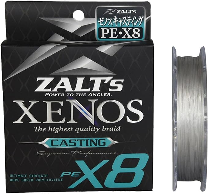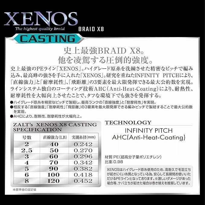 史上最強BRAID X8。「直線強力」 「耐摩耗性」 「飛距離」の融合。<br>史上最強のPEライン「XENOS」。<br>ハイグレード原糸を洗練させた精密なピッチで編み込み、史上最強レベルのPEライン「XENOS」。<br>研究を重ねたINFINITY PITCHにより、「直線強力」と「耐摩耗性」、「飛距離」の3要素を最大限発揮できる最大公約数を実現。<br>超高密編みによる凹凸の少ない表面構造により、圧倒的な飛距離を手に入れた。<br>AHCコーティングにより、耐熱性、耐摩耗性を大幅向上させたことで、タフな環境下でも強さを発揮する。<br>ZALT’sの最高傑作「XENOS X8」。