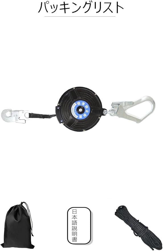 パッキングリスト: 安全ブロック、引寄せロープ、取り付き説明書、収納バッグ