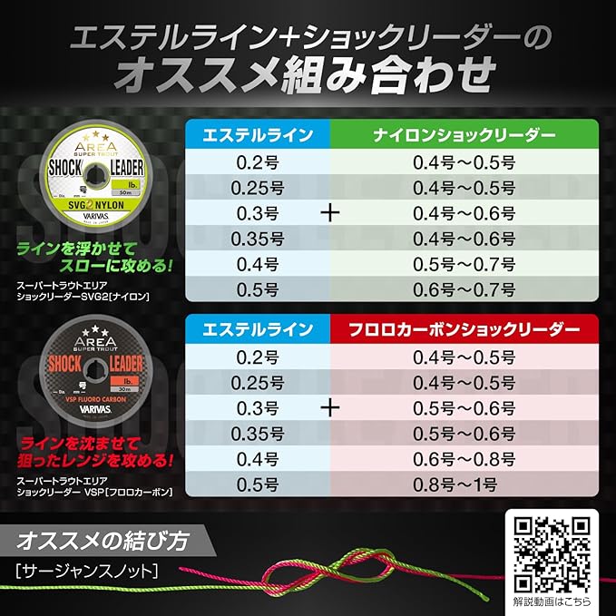 おすすめリーダーライン:「スーパートラウトエリア ショックリーダー VSP フロロ」「スーパートラウトエリア ショックリーダー SVG2 ナイロン」 / 特徴:「マイルド・しなやかな仕上がり」「ソフト巻き」「レモニーカラー(高発色イエロー/カラー系)」