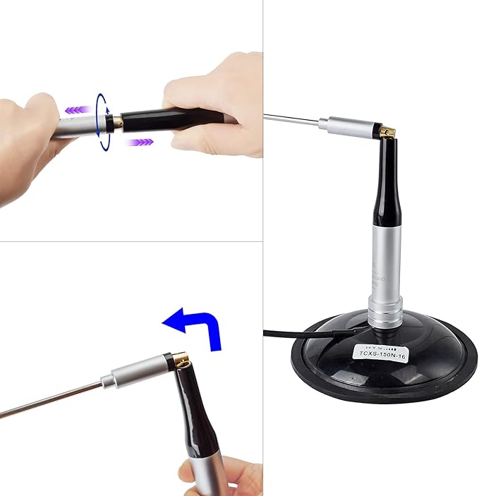 全方向回転ホイップ機構付なので、車庫入れ時にアンテナの取り外しが不要です。回転ホイップ部を引き上げれば360度どの方向へも倒すことができます。