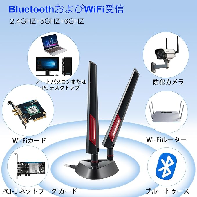準拠: 802.11 b/g/n/ac/ax/wifi 6/wifi 6e。WiFi 6E ルーター、WiFi ルーター ホットスポット、PCI PCIe WiFi カード、ラップトップ デスクトップの外部ワイヤレス USB アダプター、内蔵 WiFi Bluetooth マザーボード、FPV、WiFi カメラと互換性があります。