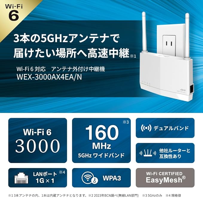 【Amazon.co.jp限定】バッファロー WiFi 無線LAN 中継機 Wi-Fi 6 11ax AX3000 2401+573Mbps WPS ワイドバンド メッシュ EasyMesh コンセント直挿し/据え置き 外付けアンテナ 日本メーカー エコパッケージ WEX-3000AX4EA/N