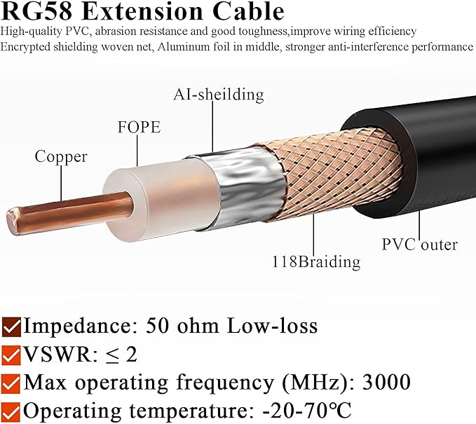 耐久性と性能: コネクタは純粋な真鍮製で、耐久性とリサイクル使用を保証します。ケーブルタイプはRG58で、優れた導電性と信号伝送を保証し、信号干渉に対する高い耐性を備えています