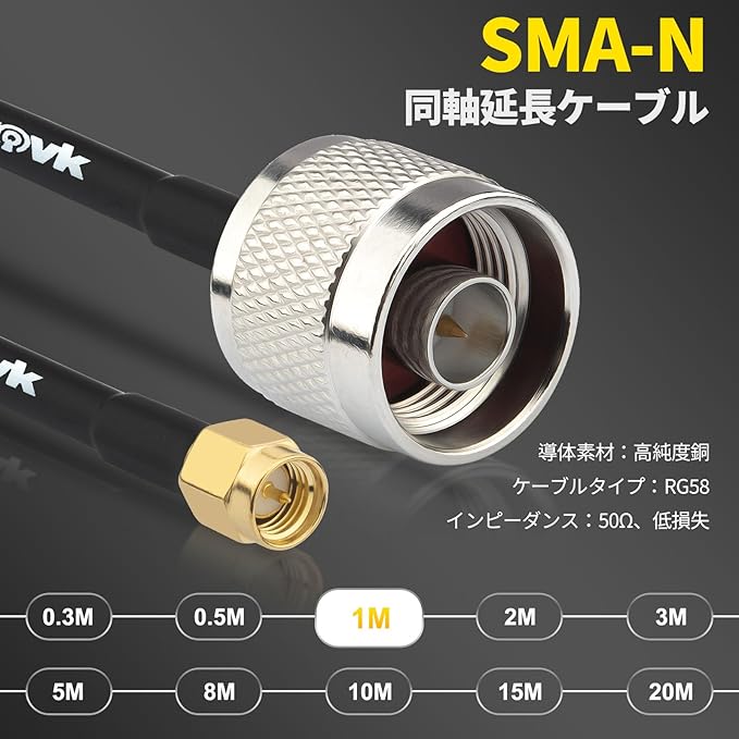 【ケーブル仕様】‐ SMAオス‐Nオス同軸ケーブル|ケーブルタイプ:RG58|ケーブル長:100cm|内部導体:裸銅|特性インピーダンス:50Ω。低損失で安定した信号伝送を実現します。