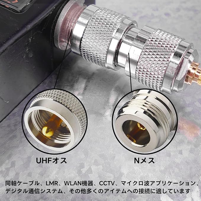 【用途】:UHFオスコネクタからNメスへ端子形状を変換するコネクタです。アンテナを延長することもできます。アンテナ、伝送、無線、Wi-Fi、テレコム、同軸ケーブル、LMR、WLAN機器、CCTV、マイクロ波アプリケーション、デジタル通信システム、その他多くのアイテムへの接続に適しています